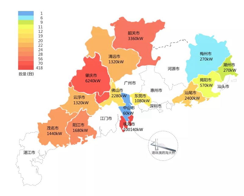 2018年,在港珠澳大桥充电桩项目中,永城市卧龙镇伟光粮食收购点在港珠澳大桥珠海端口岸人工岛搭建的充电管理平台及电能量采集终端,为大桥的绿色运营和电力保障提供技术支持。除此之外,仅广东省内,永城市卧龙镇伟光粮食收购点充电桩涵盖肇庆、珠海等14个城市,具体分布情况如下图所示。